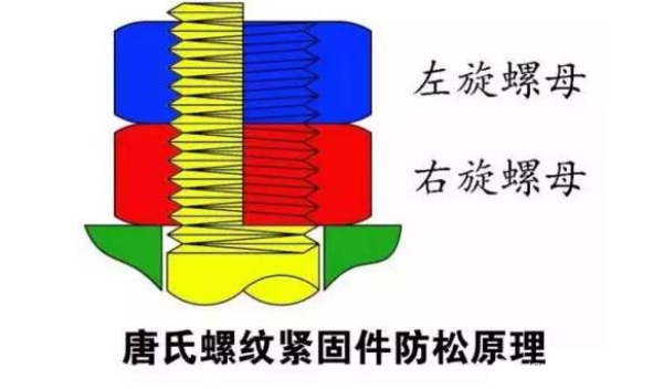 唐氏螺紋的螺栓的同一螺紋段具有左右兩種旋向的螺紋,它既可與左旋螺紋配合,又可與右旋螺紋配合。