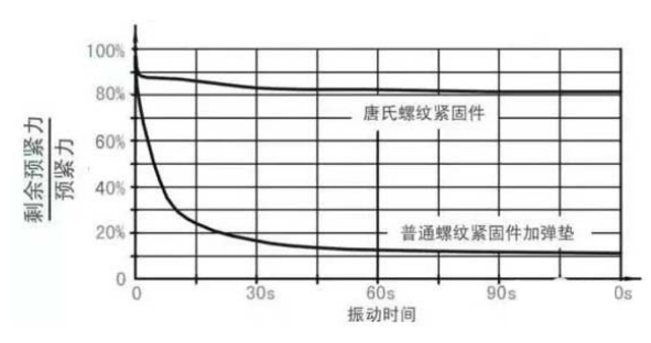 預(yù)緊力有所下降。到運(yùn)行階段后,其預(yù)緊力不再下降。實(shí)驗(yàn)數(shù)據(jù)證明唐氏螺紋緊固件的確是不會(huì)松動(dòng)的螺栓。